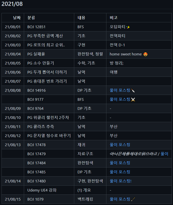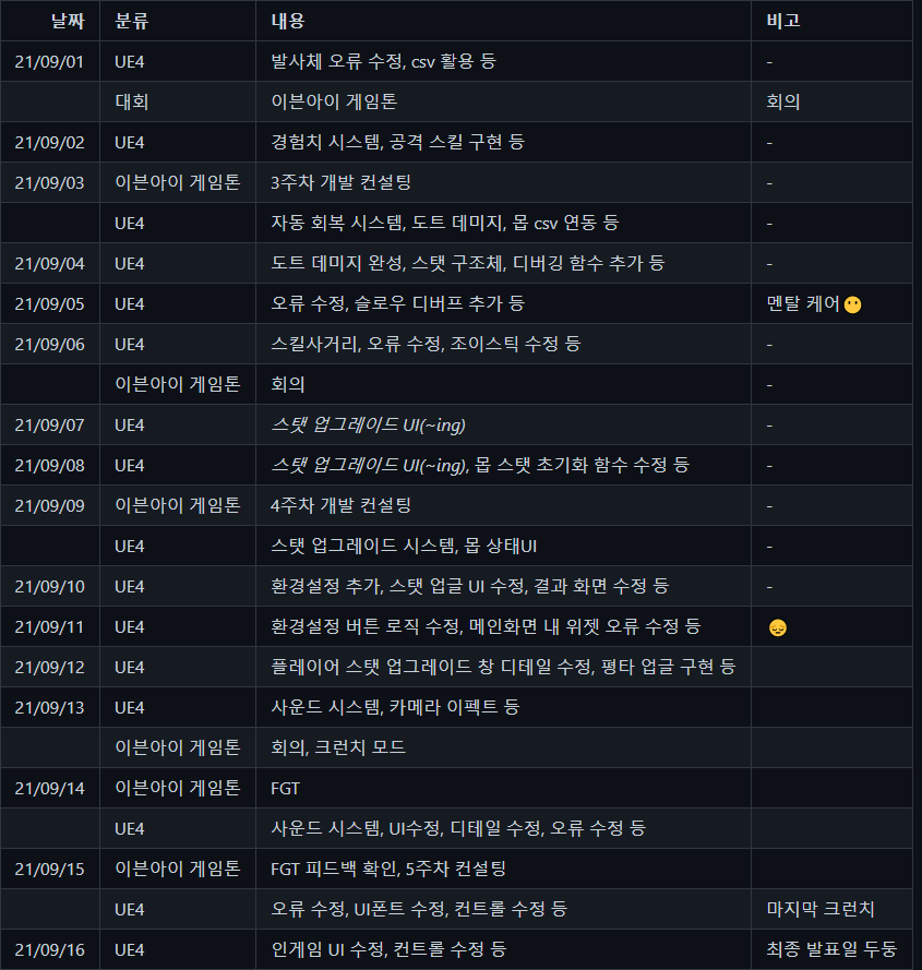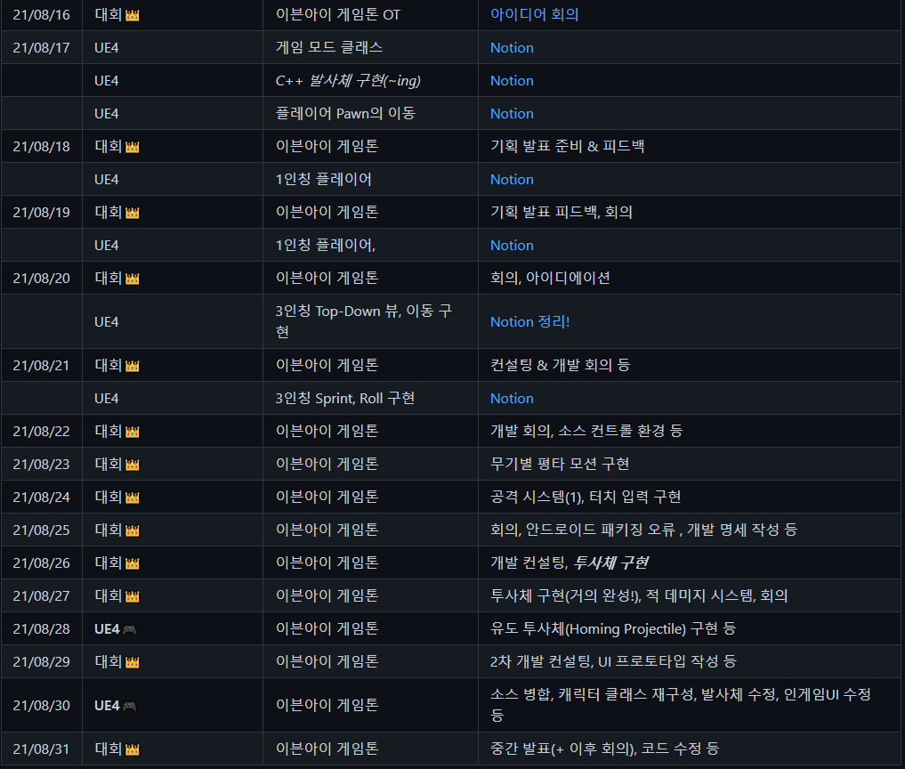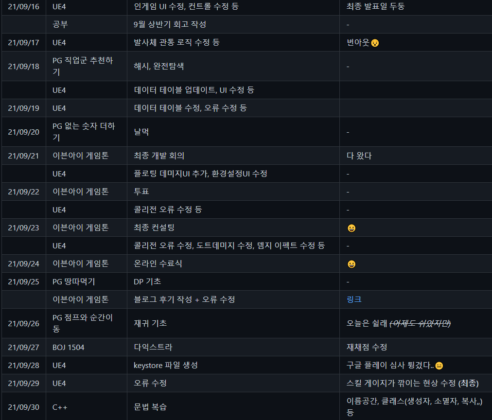 [2021년 10월 02일 오전 11시 01분 작성] [회고] 2021년 10월 하반기 1. 공부 내용 게임톤의 막이 내렸다. (물론 구글 플레이 업로드는 끝이 나지 않았지만,,) 아무튼 이 기간동안 공부한 내용과 한 것을 정리해보자. - 게임톤 오류 수정 (구글 플레이 업로드, 게임 오류 등) - UE4 구글 플레이 업로드 방법 (.keystore 파일 생성 등) - C++ 문법 복습 / 윈프 복습 - 알고리즘 문제 깔짝.. 2. 반성 계획을 반 이상 지키지 못했다. 게임톤이 끝나고 지금 좀 번아웃이 쎄게 온 상태인데, 어서 정신을 차려야지. 3. 상반기 계획 0. 1일 1커밋 1. 게임톤 진짜 마무리 - 구글 플레이 업로드 - 팀원들과 자료 정리 2. 언리얼 엔진4 - 게임톤 복습용 토이 프로젝트 -..